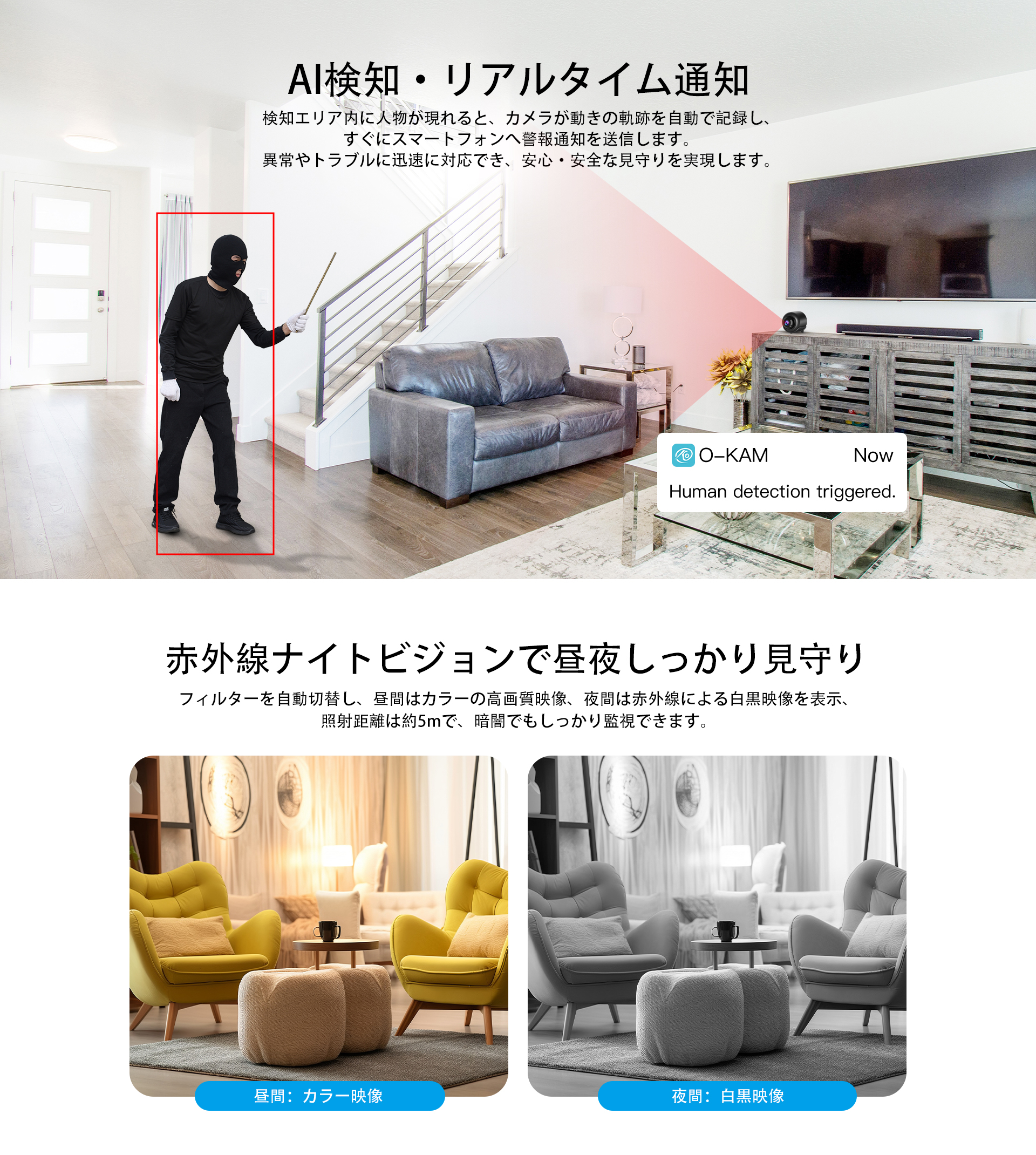 ・AI人物検知+動体検知でリアルタイム通知