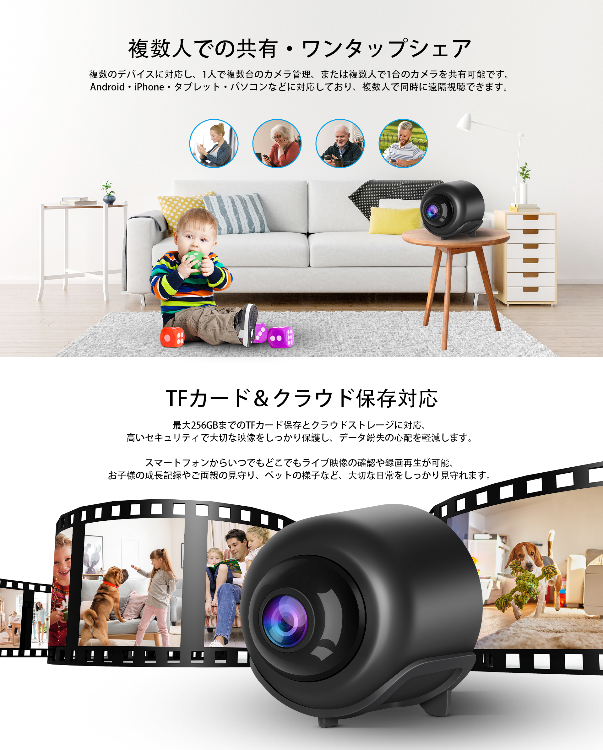 ・保存方法:TFカード(最大256GB)、クラウド